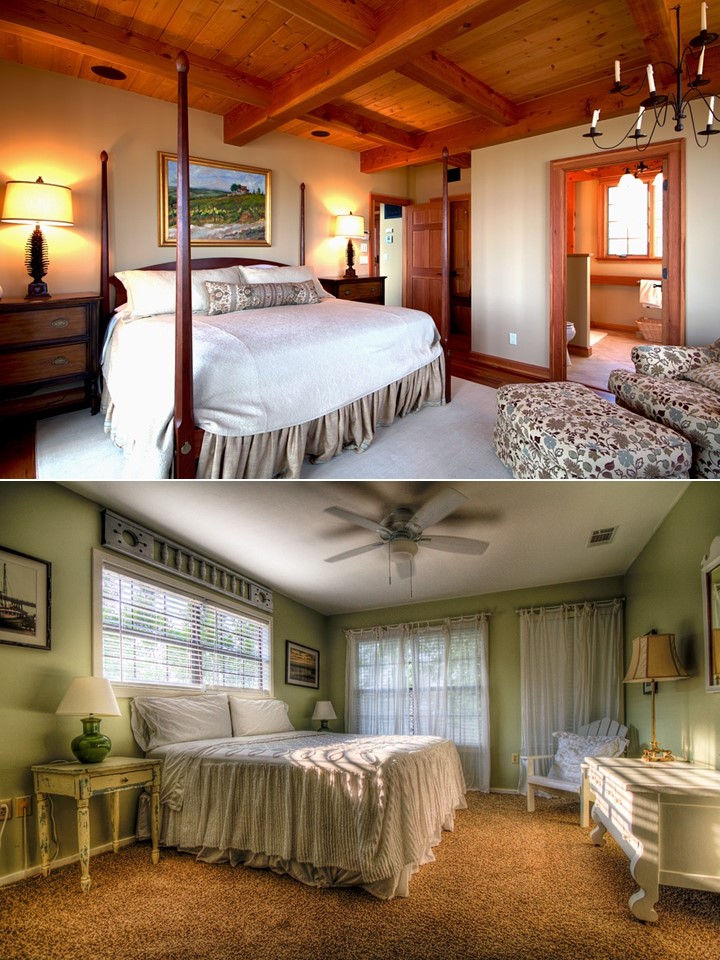 My first case study compares two modest bedrooms that are similarly sized and contain almost identical types of furniture. But as you probably can sense right away, and leaving aside your stylistic preferences, the top bedroom feels relatively full, over-furnished, and confining, while the bottom bedroom seems more open, expansive, and therefore elegant – and it notably achieves these outcomes with less expensive furniture pieces.