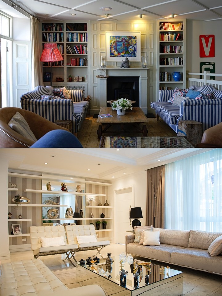 The second case study looks at two living rooms with similar differences and issues as in the first example. Again, leaving aside our personal tastes in design and decoration, the top living room feels and can be factually understood as excessively compacted, filled, and restricted. It has comparatively more limited opportunities for movement and a greater number of divergent surfaces and textures – ones that ultimately obscure or waste, rather than liberate, the room’s waiting natural space and elegance.