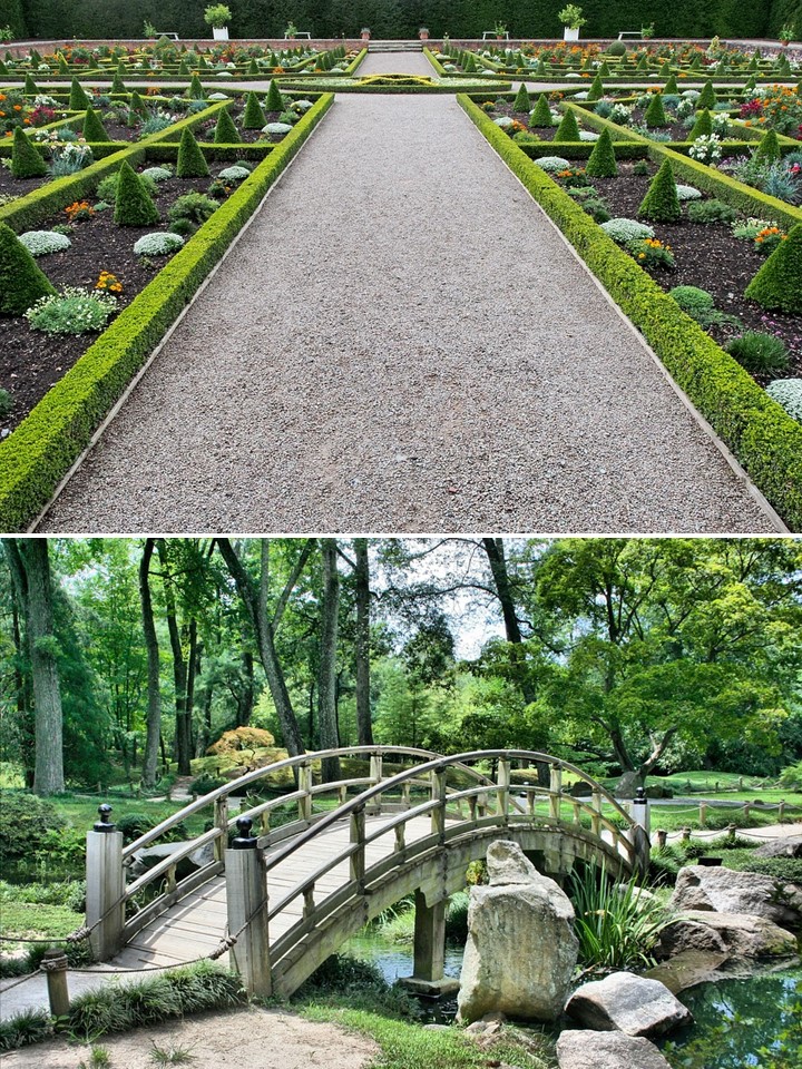 Though this example involves comparing two garden spaces, the principles are the same as indoors, and in many other design areas too. In this example, the lower garden is comparatively modest in size and materials, but opens the space through easy circulation, a mix of filled and unfilled areas, and the use of soft or receding colors and textures.
