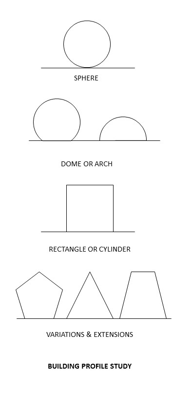 For our first study, examining building profiles, or their basic shape or street view, I have begun with the sphere in my first exhibit. As you likely know, this shape is naturally or geometrically the most efficient in terms of minimizing surface area for a given volume, and thus can be relatively efficient in terms of enclosing interior space, and heating and cooling space too.