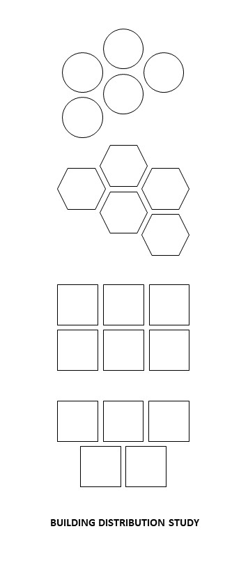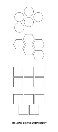 Our second study moves from considering the efficiency of basic building shapes or profiles to that of overall building distributions, or the general organizing plans, layouts, or top-down views of buildings and developed areas. As the first graphic in the second exhibit highlights, round, spherical, and cylindrical buildings, rooms, and other spaces are most efficiently planned in an alternating honeycomb format, though this still leaves significant unused space between buildings, even when they touch.