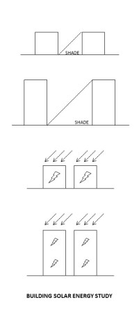 Intuitively, and as the first two graphics in the third exhibit illustrate, any building will cast an amount of shadow in sunlight, and of course in proportion to its overall shape, size, and height. When buildings require no energy input or benefit from shade, such shadowing is not a problem or source of inefficiency, and even may result in efficiency gains.